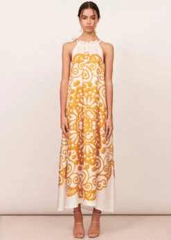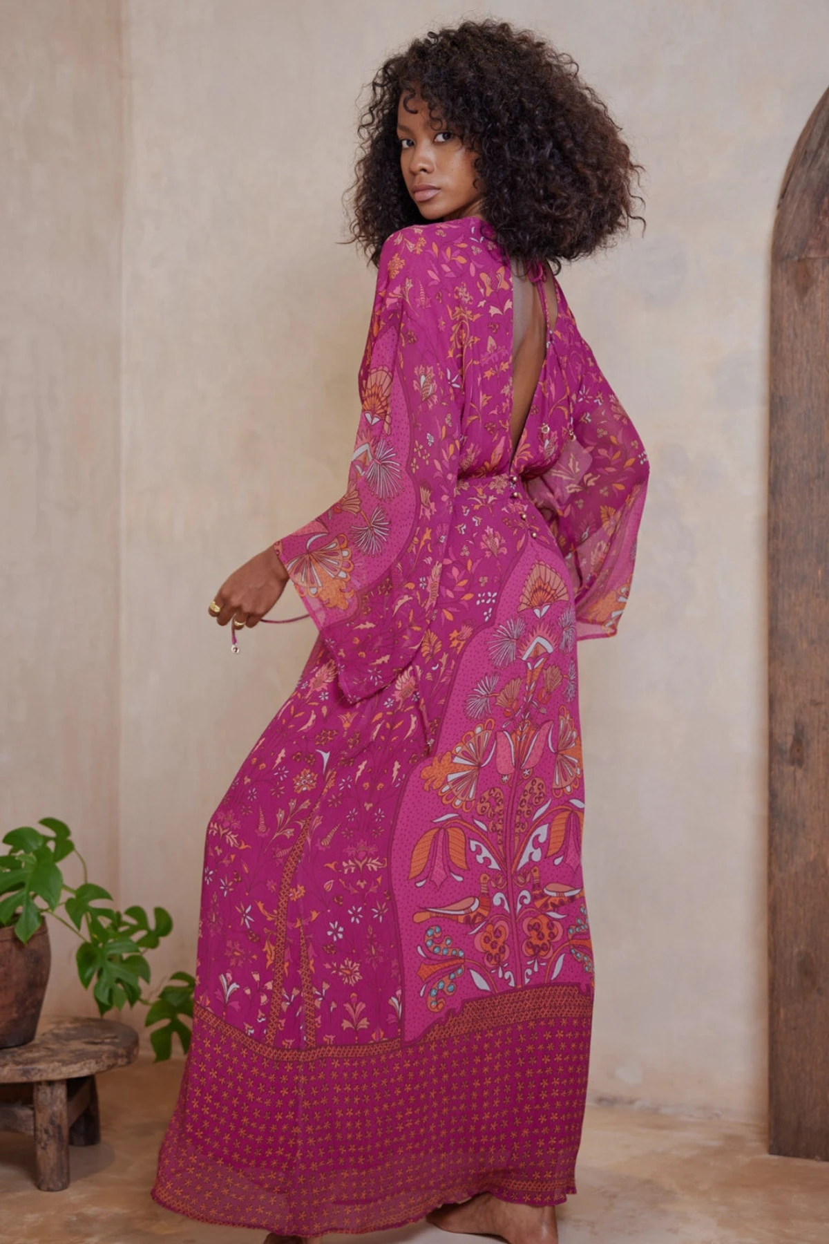 Inspired by intrinsic vintage florals and the elegant artworks of alluring birds, we meet Alexandria. This diverse series is born in three bold colourways, each portraying detailed print works on a soft viscose fabrication. The Alexandria Manda Maxi Dress offers a perfect balance of elegance and luxury for any special occasion. With a delicate sheer layer, deep V-neckline featuring an adjustable hook and eye closure, and kimono-style sleeves, this exquisite maxi dress is sure to turn heads. The eye-catching rouleau tie detailing at the sides and tie and antique brass value closure at the back give the piece a sophisticated and exclusive look.