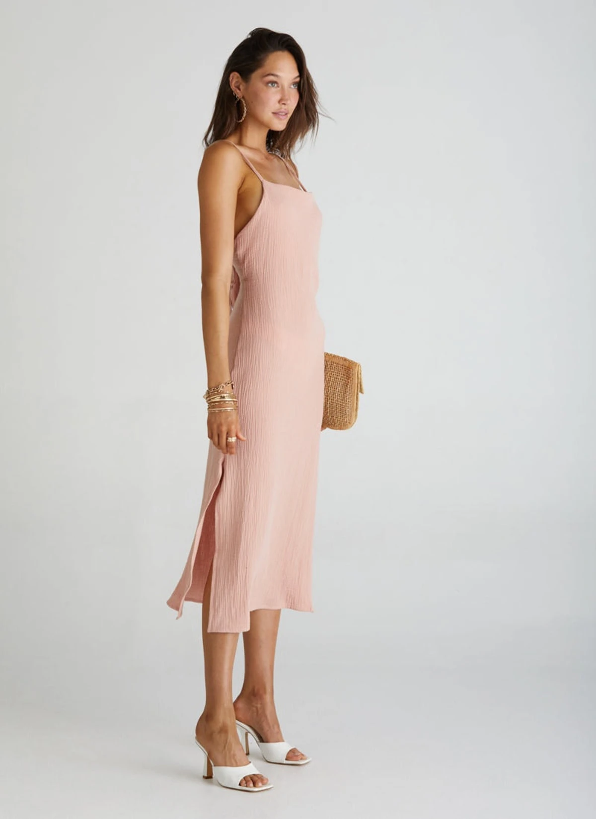 The Cross Back Midi Dress is the perfect day-to-night dress that is suitable for every occasion. Featuring a cross back tie design, front slit and a midi length silhouette, elevate your style and pair with white sneakers and gold accessories.