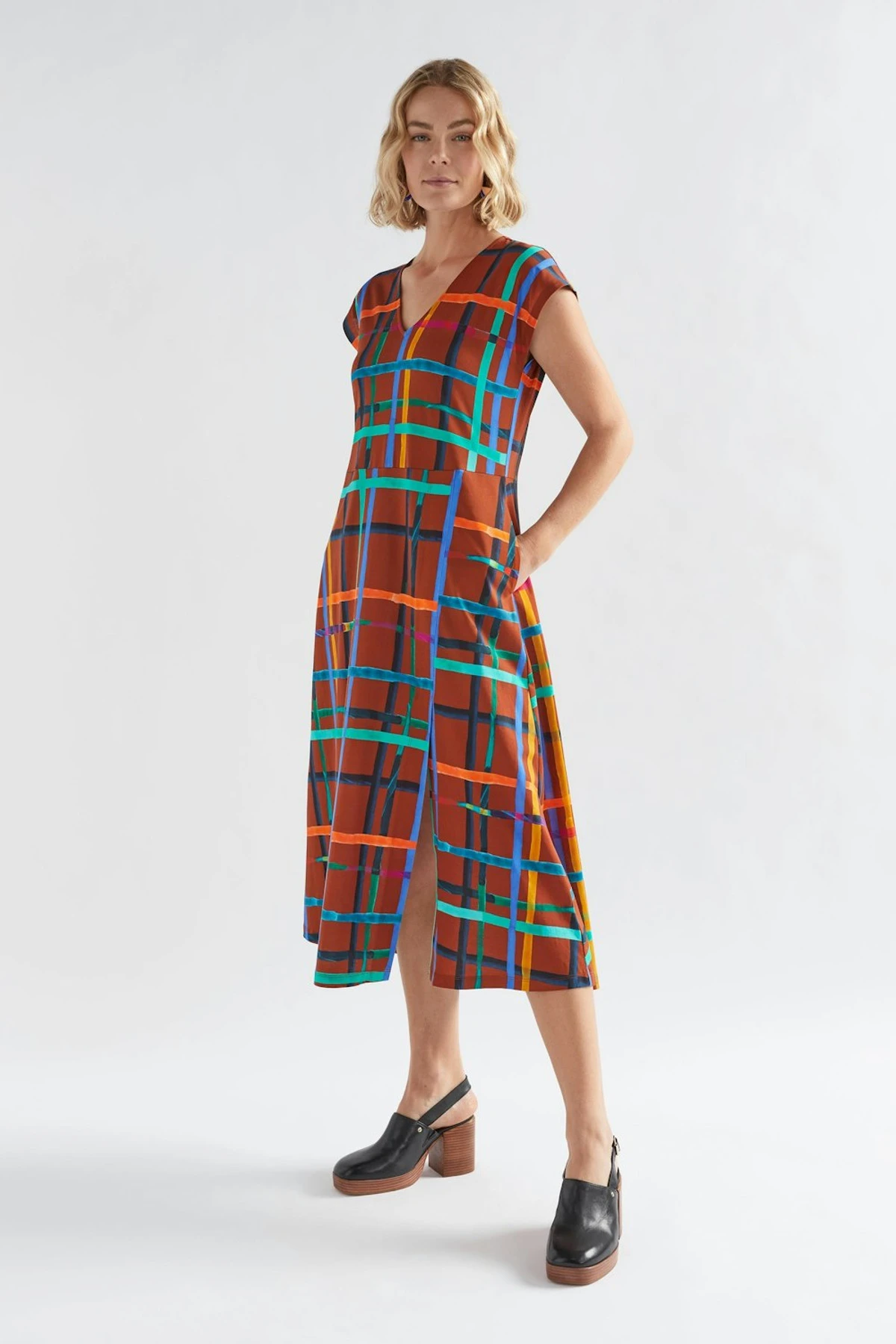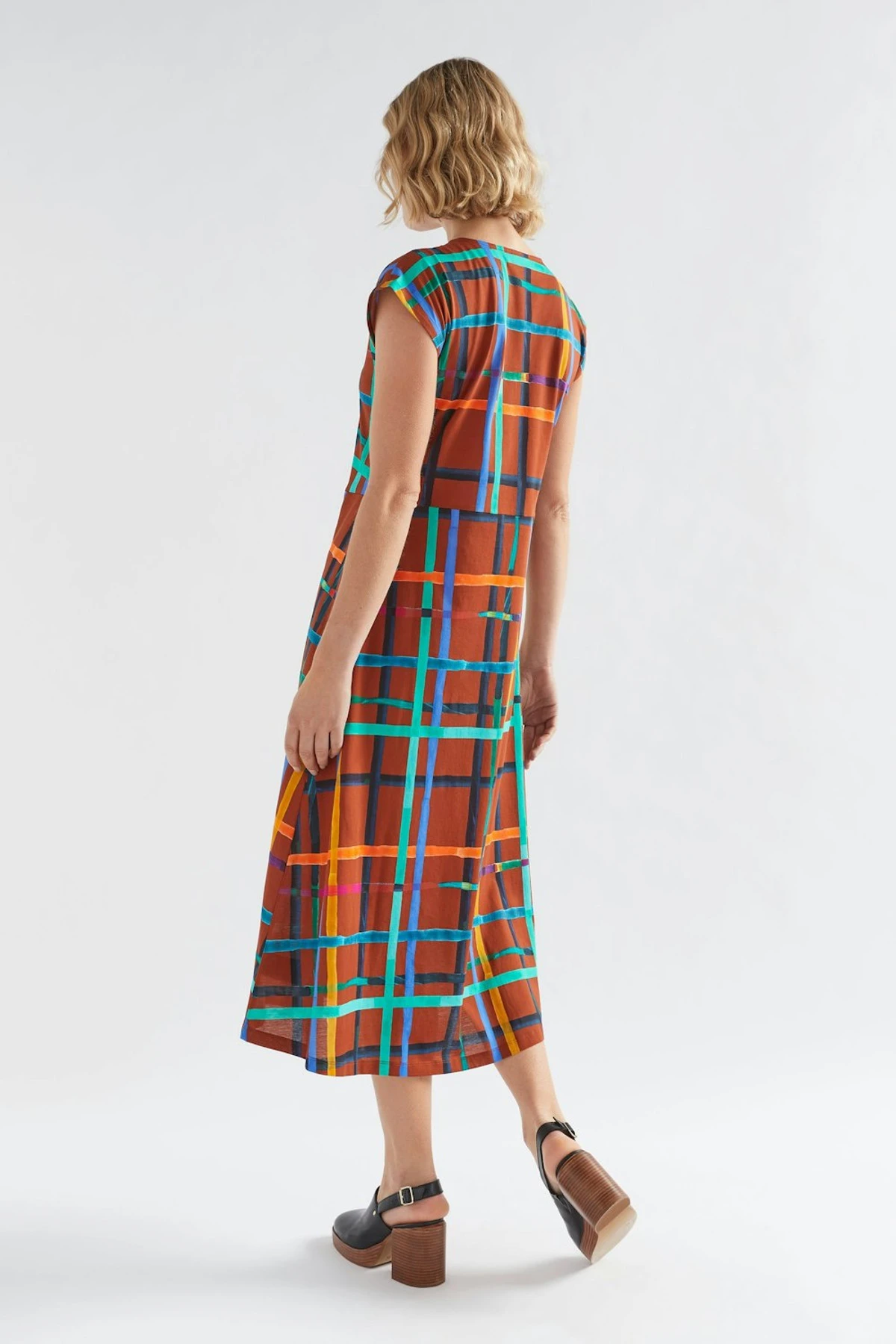Crafted from 100% organic cotton, the Dela T-shirt Dress is a midi length, V-neck t-shirt dress in a modern tartan print. The dress has an extended shoulder creating a cap-like sleeve, and a waist seam. With a wrap pleat to the front left of the skirt that opens to about knee level, the dress also has side seam pockets. This organic cotton dress has a soft, breathable feel and a subtle structure.