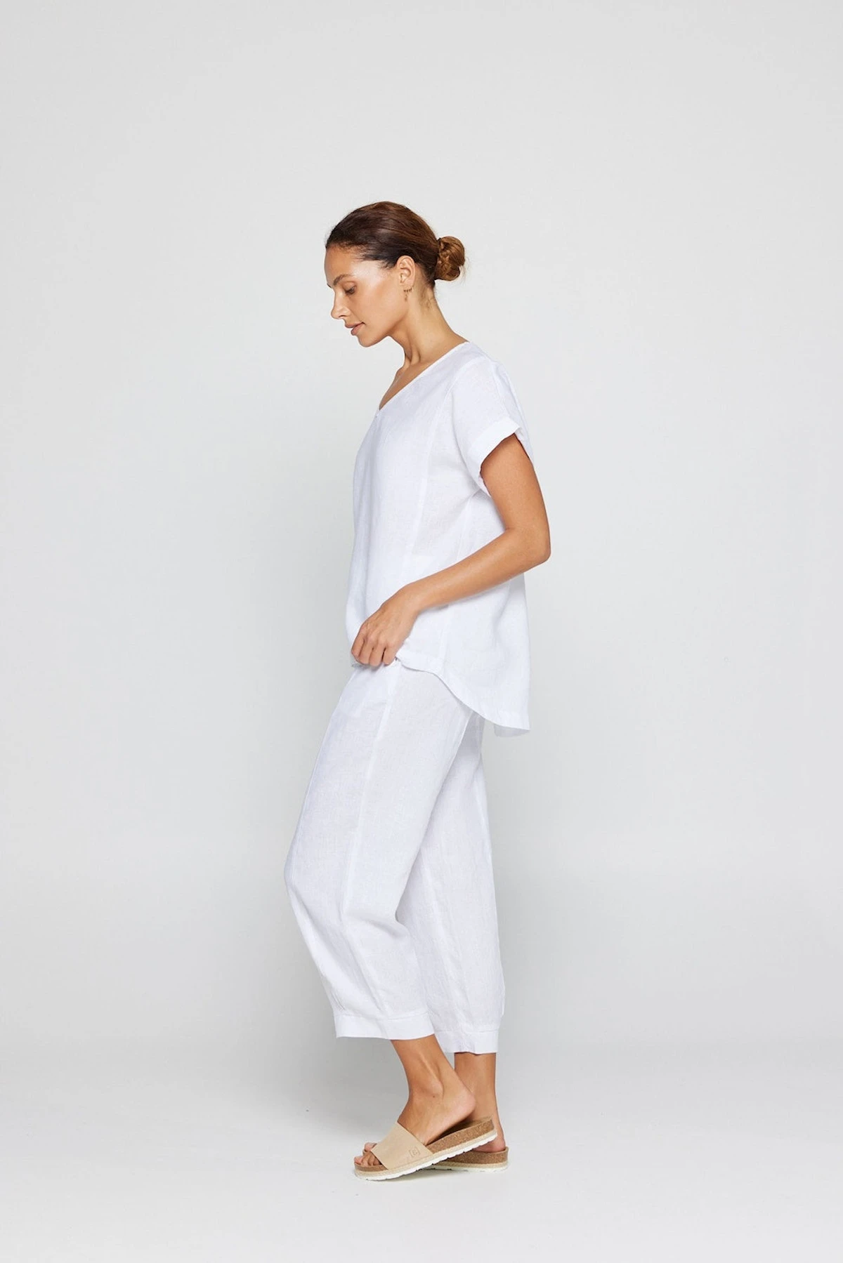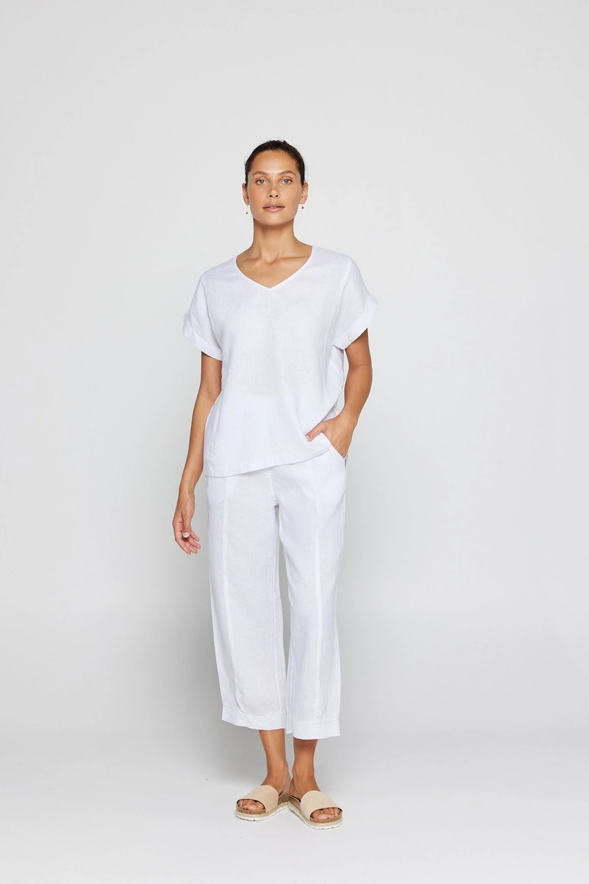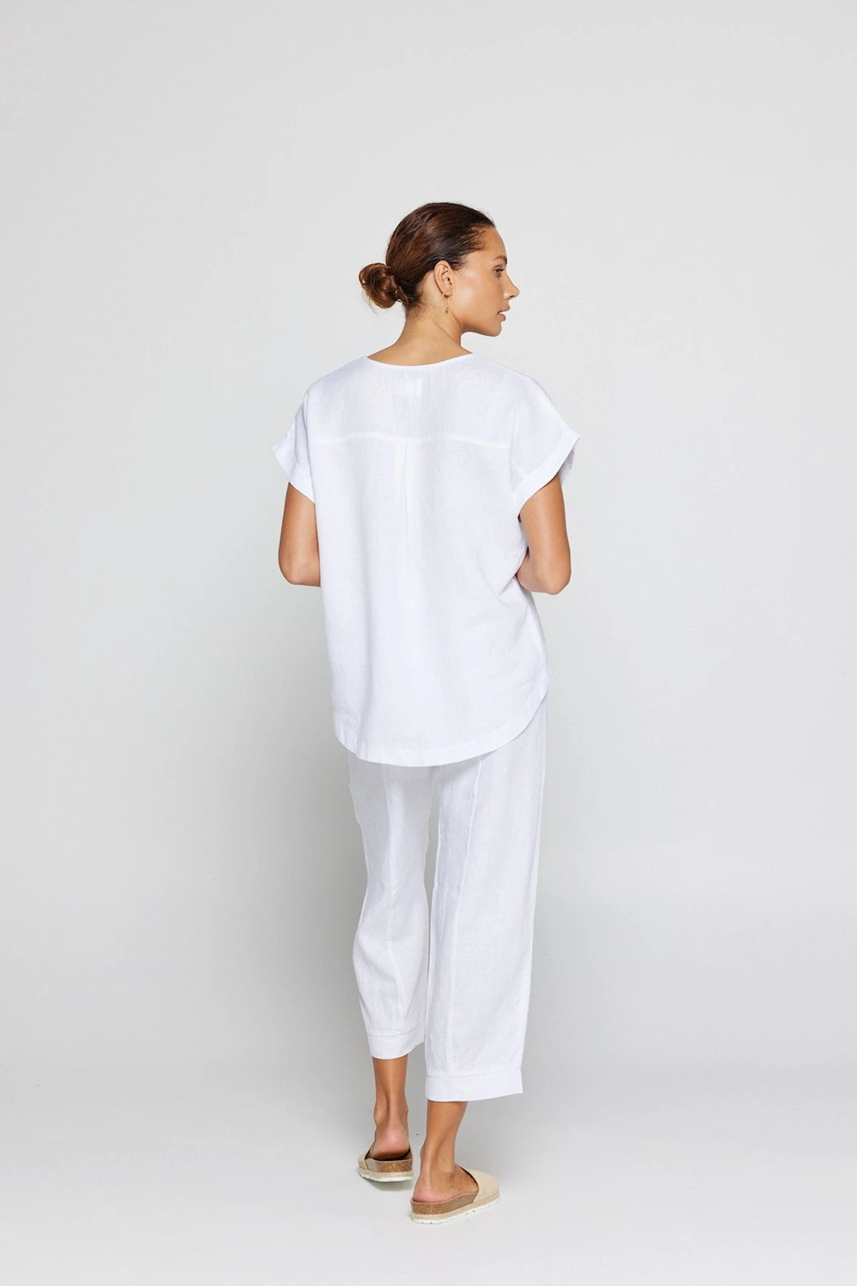 The By Ridley Lacey Tee made from 100% Linen is a new take on a By Ridley favourite. Featuring a V neckline, panels, and sleeve cuff this classic tee is a wardrobe staple. Perfect to style with your favourite linen pant.