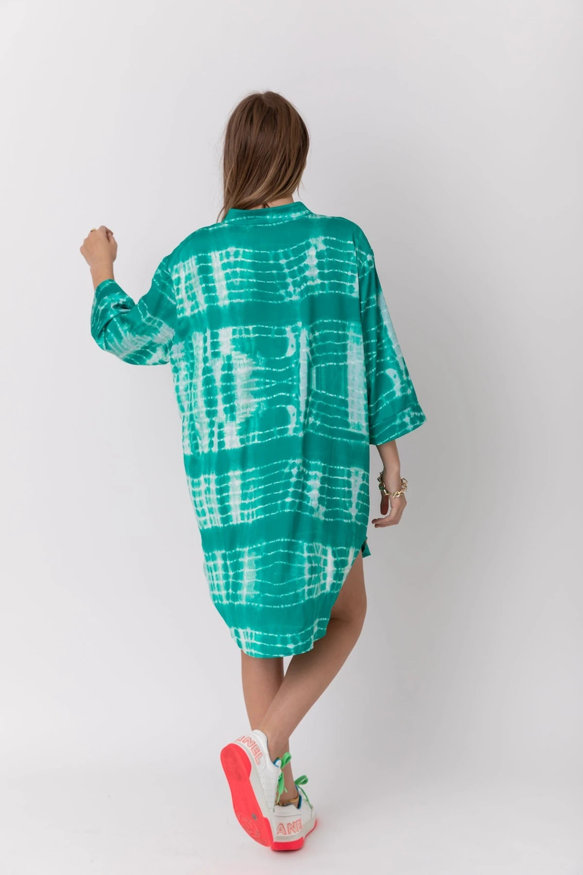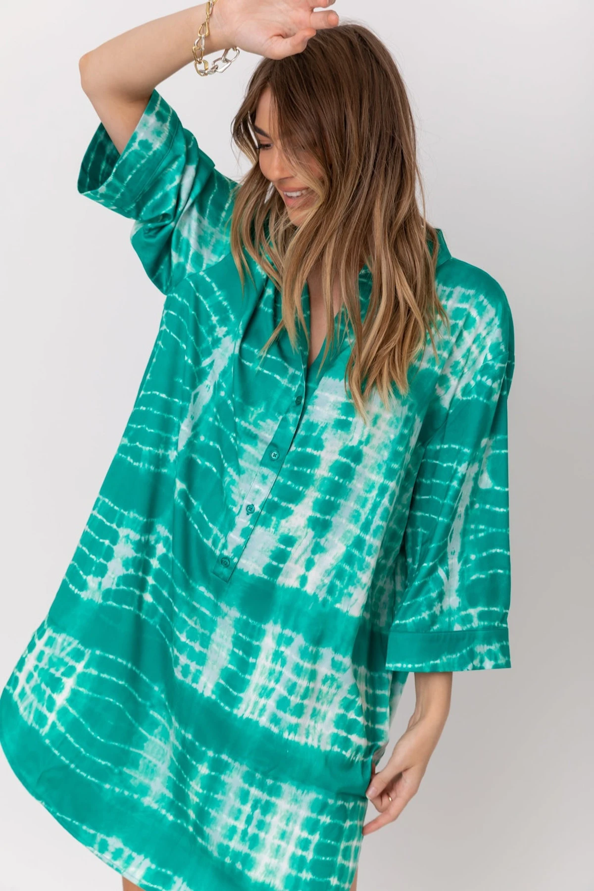 Exude casual sexiness and fun with the LOGAN dress. It is a relaxed shirt-style dress with a fun tie-dye-like print. The green hue, along with a value-down front, mandarin collar, and scooped hems, lend a sultry touch to your laidback casual look. Don it with sneakers for days off or with white pump stilettos for a sexier look.