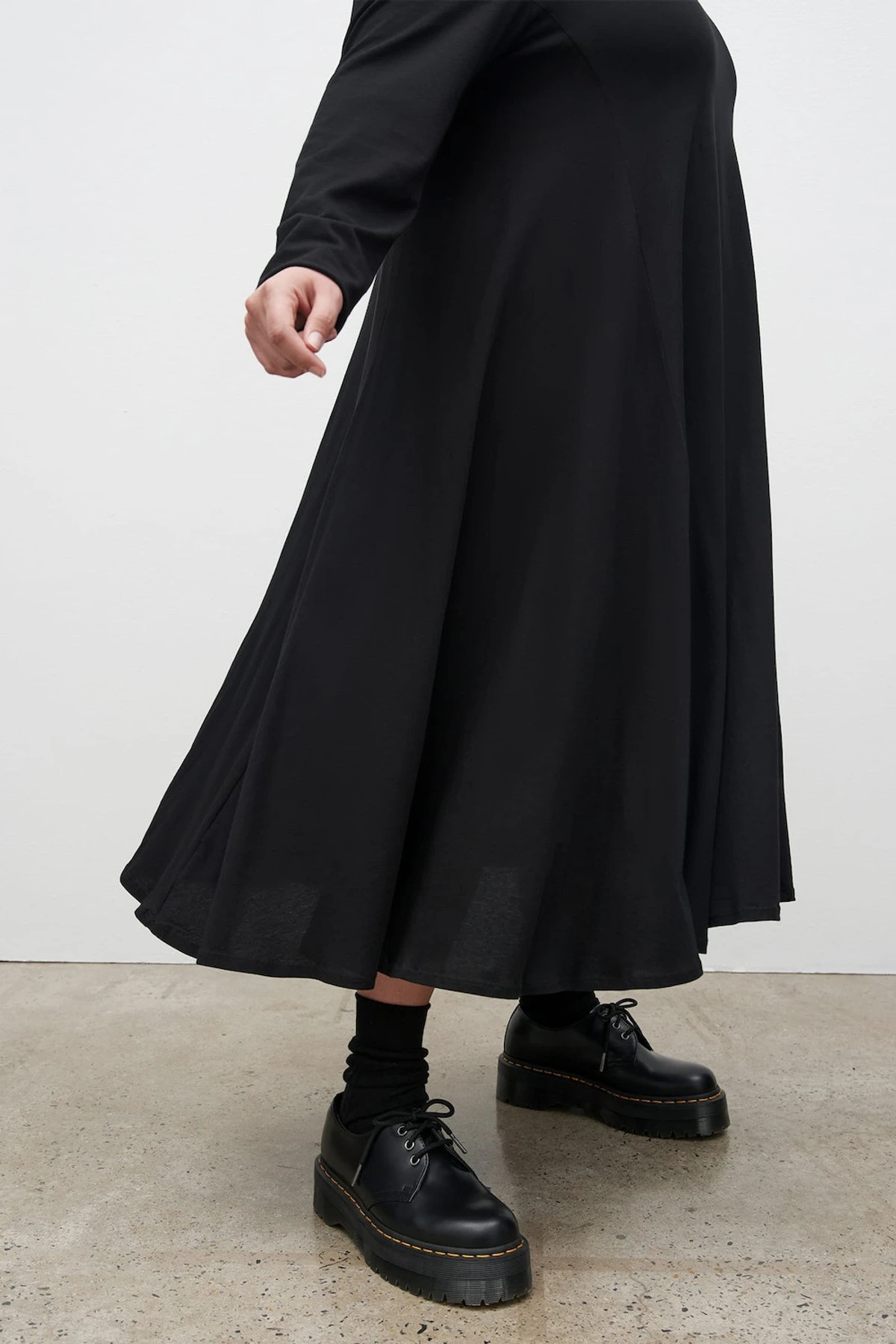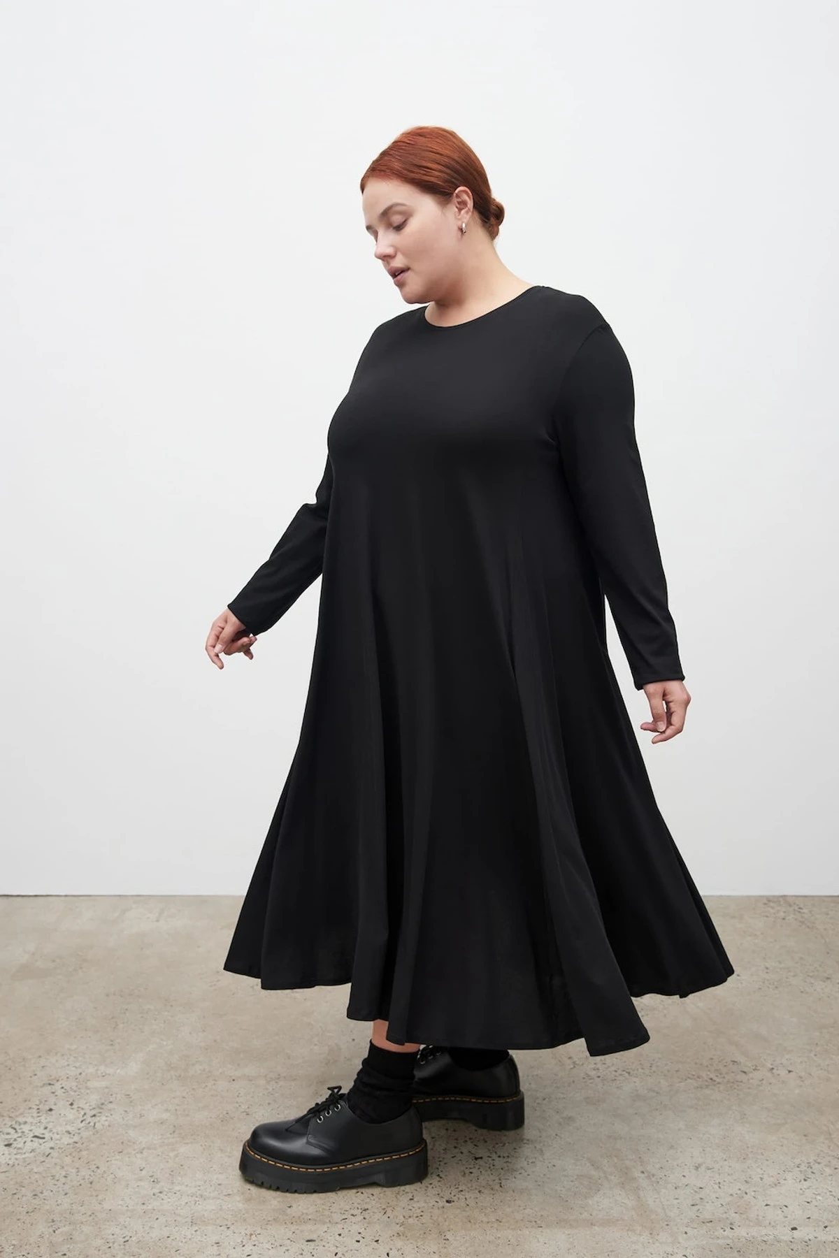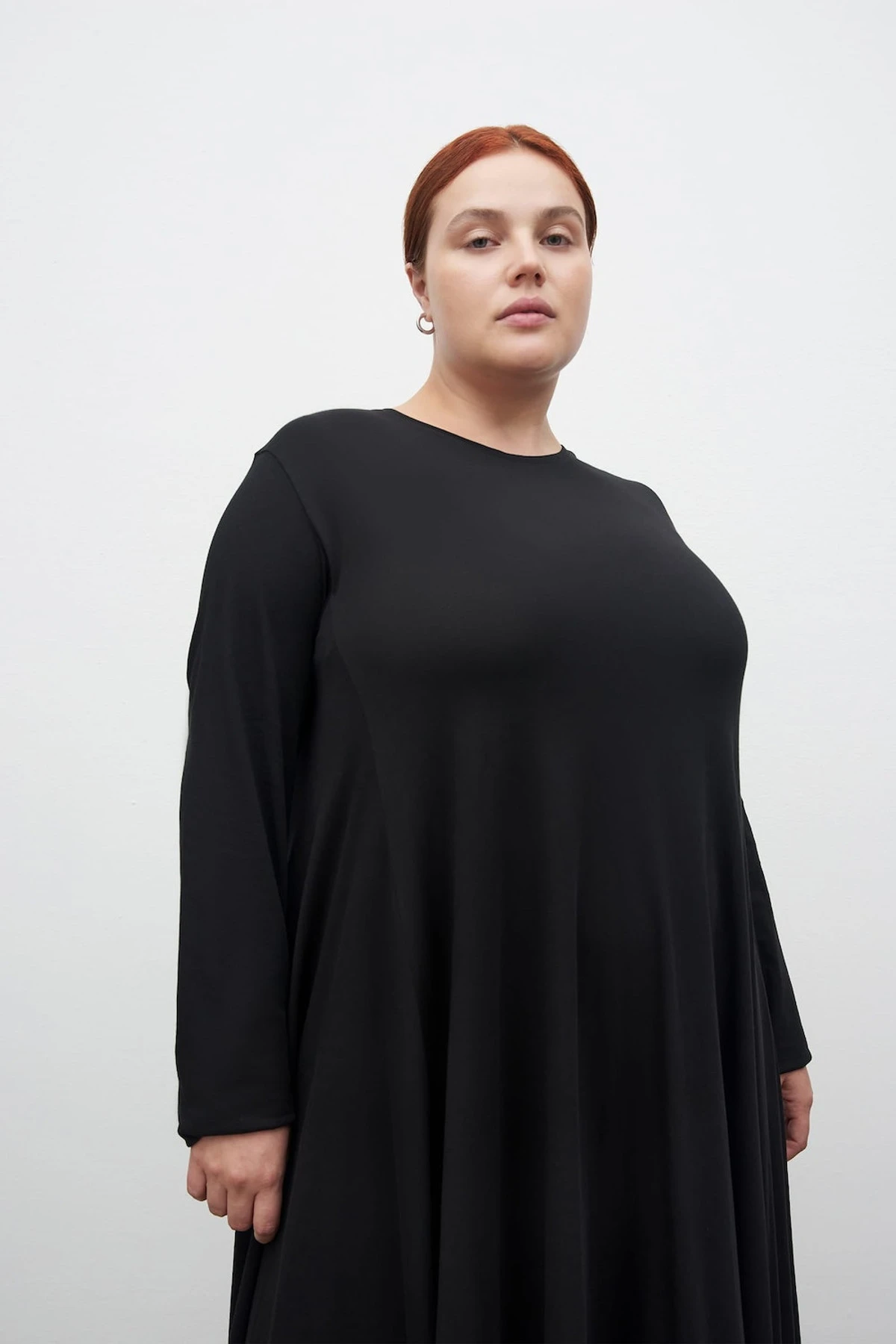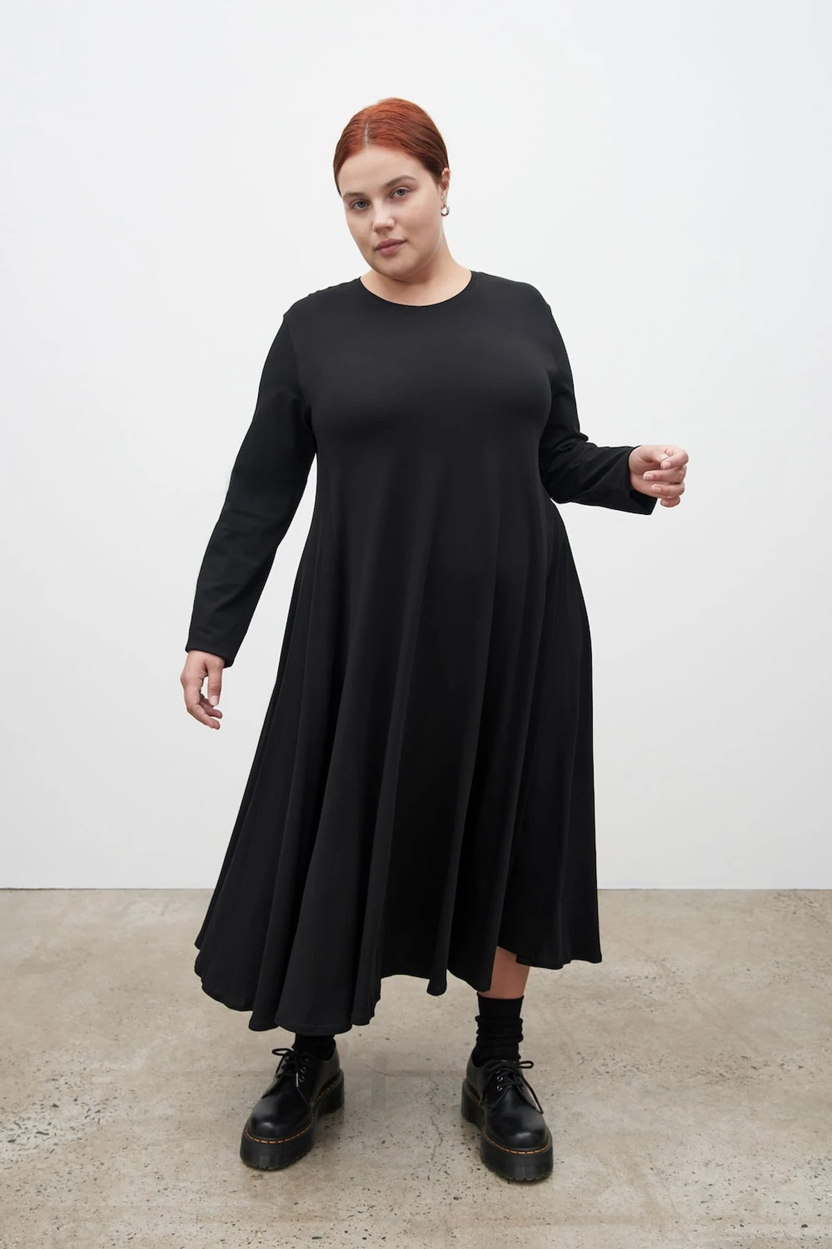 A flared dress with a round neckline and slim, long sleeves, made from 100% certified Fairtrade lightweight organic cotton jersey.