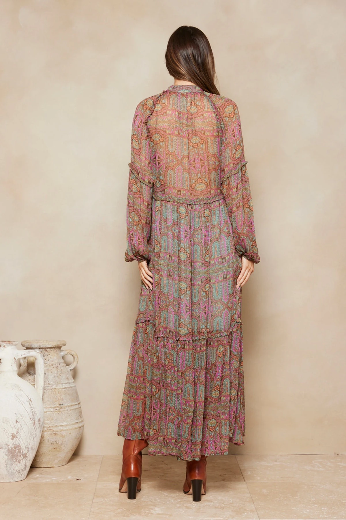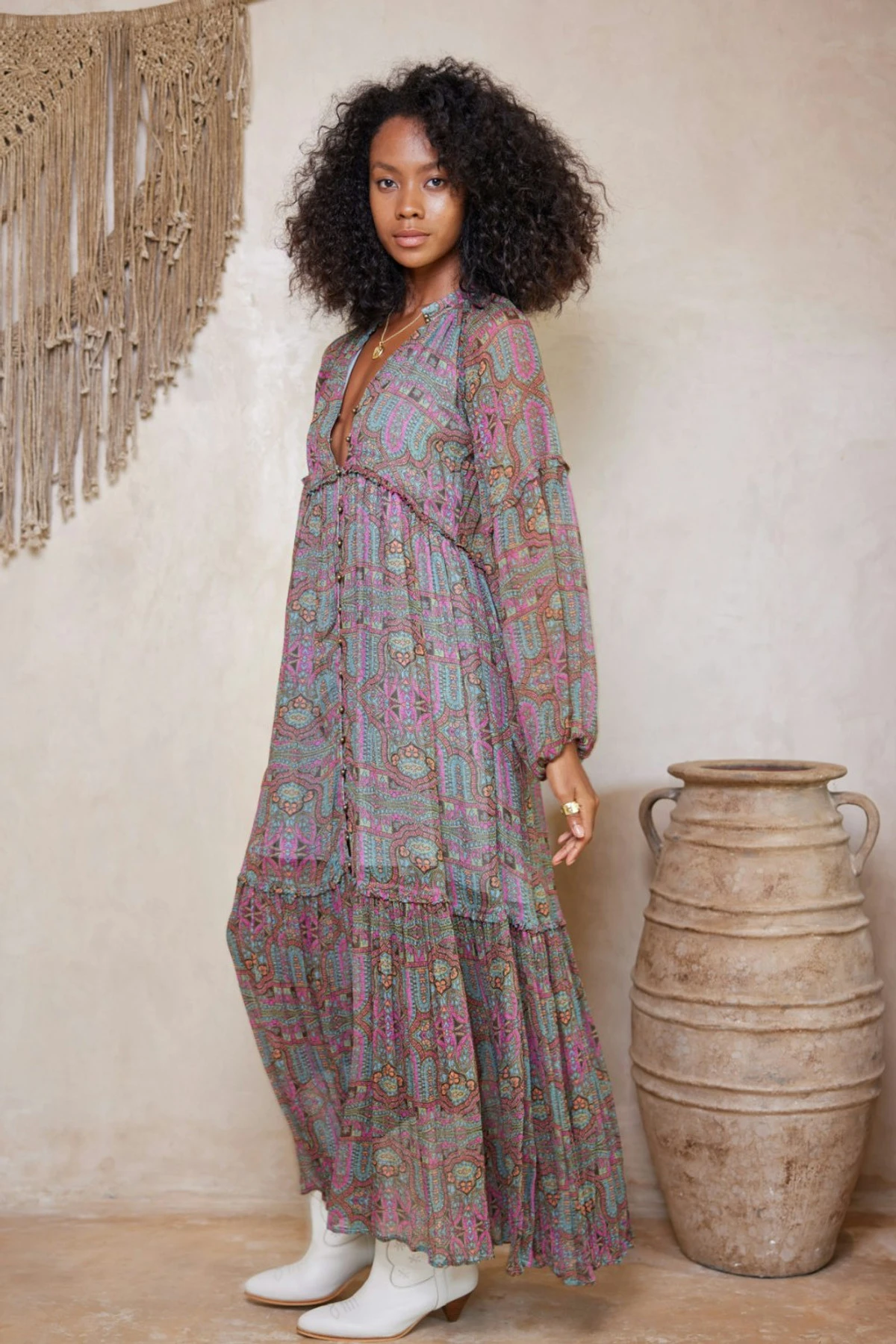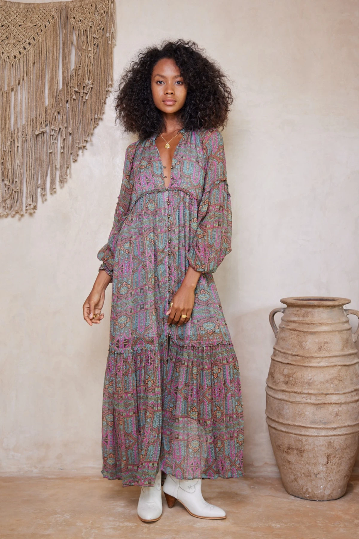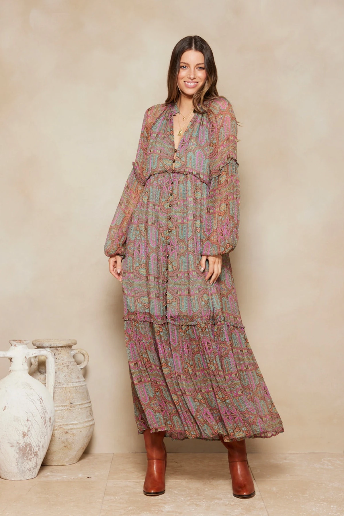 Meet Majorie. Inspired by vintage kaleidoscope artworks, in a beautiful soft viscose crinkle, this range is timeless and chic. Contemporary silhouettes meet timeless colourways from Taragon to Sandshell. Flowing and effortless textiles making this the perfect collection for your next holiday adventure. The Marjorie Isla Maxi Dress in Taragon is a beautiful piece of luxury craftsmanship. With its deep V neckline, raglan blouson sleeves, and tiered skirt panel, it is sure to add an air of sophistication to any ensemble. The floaty fabric has frill detailing throughout and is finished with a sheer, lined maxi length – perfect for making an unforgettable impression.