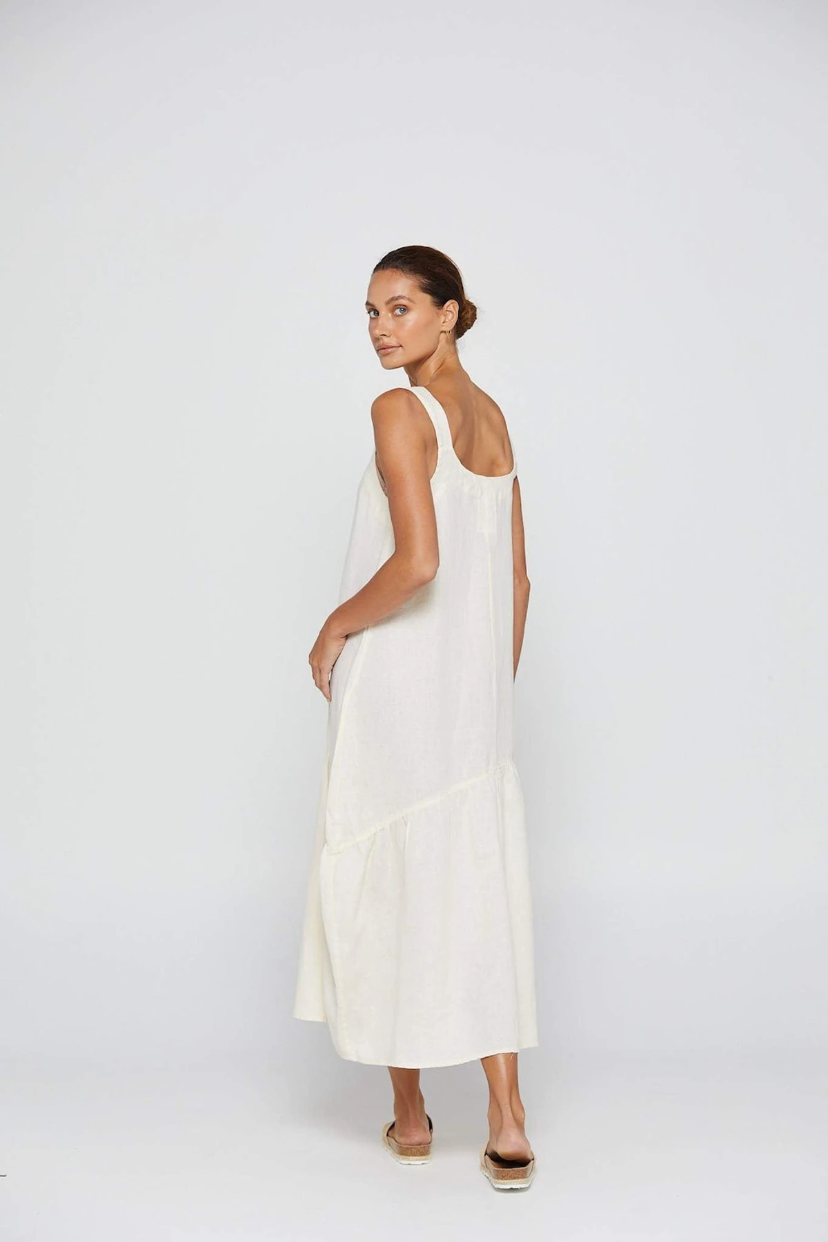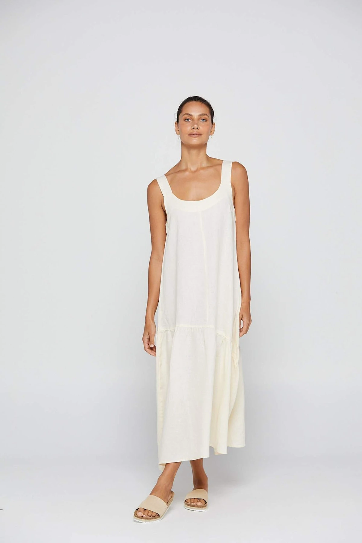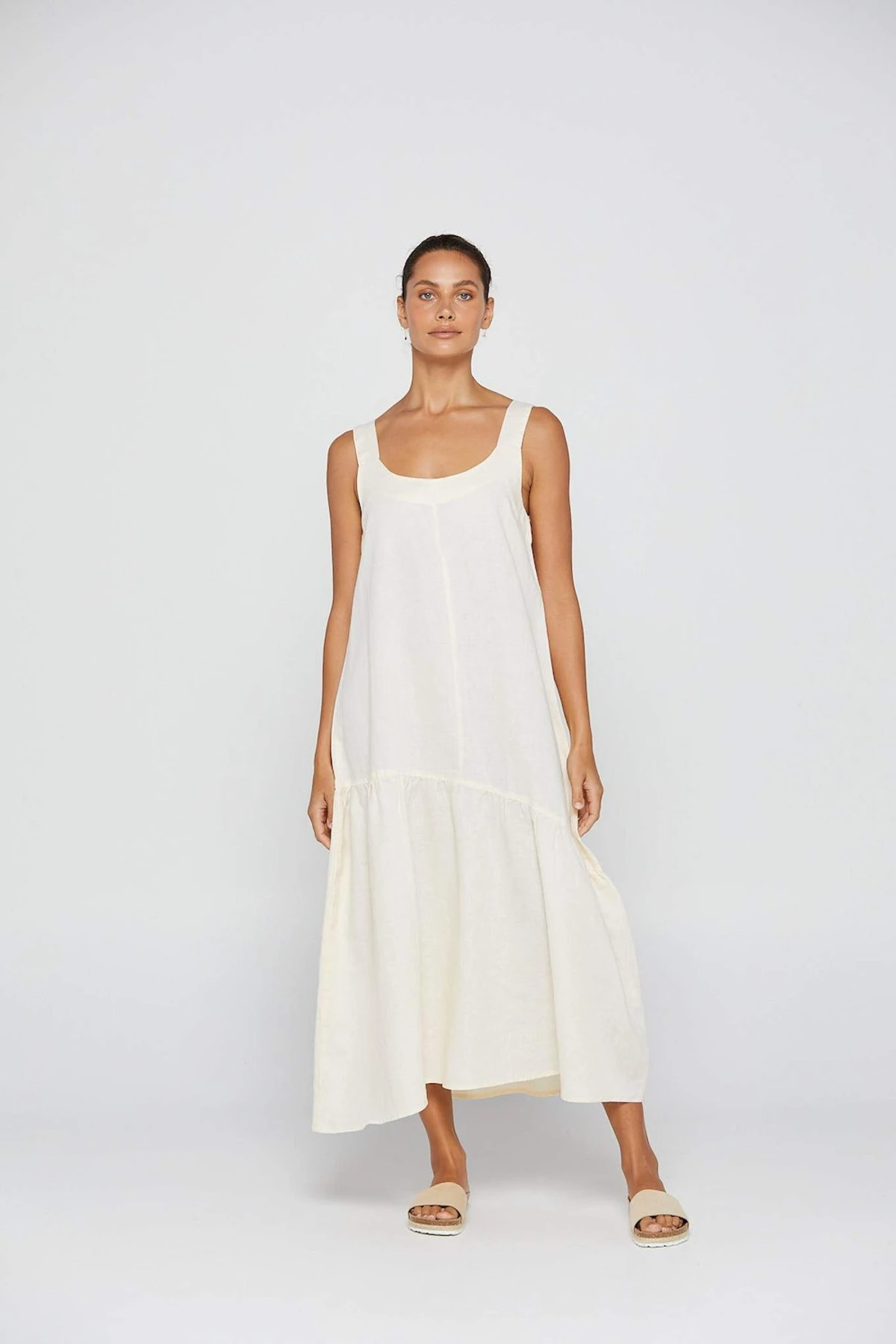 The By Ridley Melany Dress crafted from 100% linen this dress features a scoop neckline, thick shoulder straps and gathered asymmetric seam. Refresh your summer wardrobe with this flattering, summery midi dress.