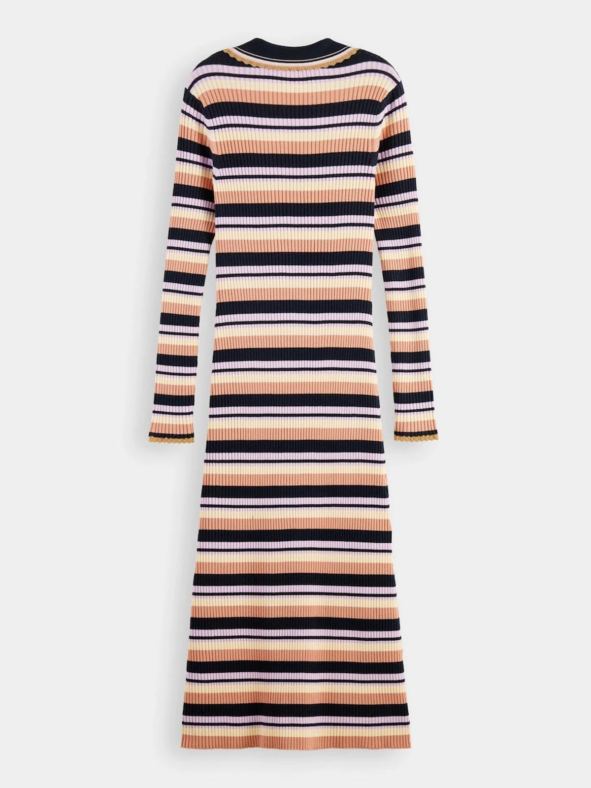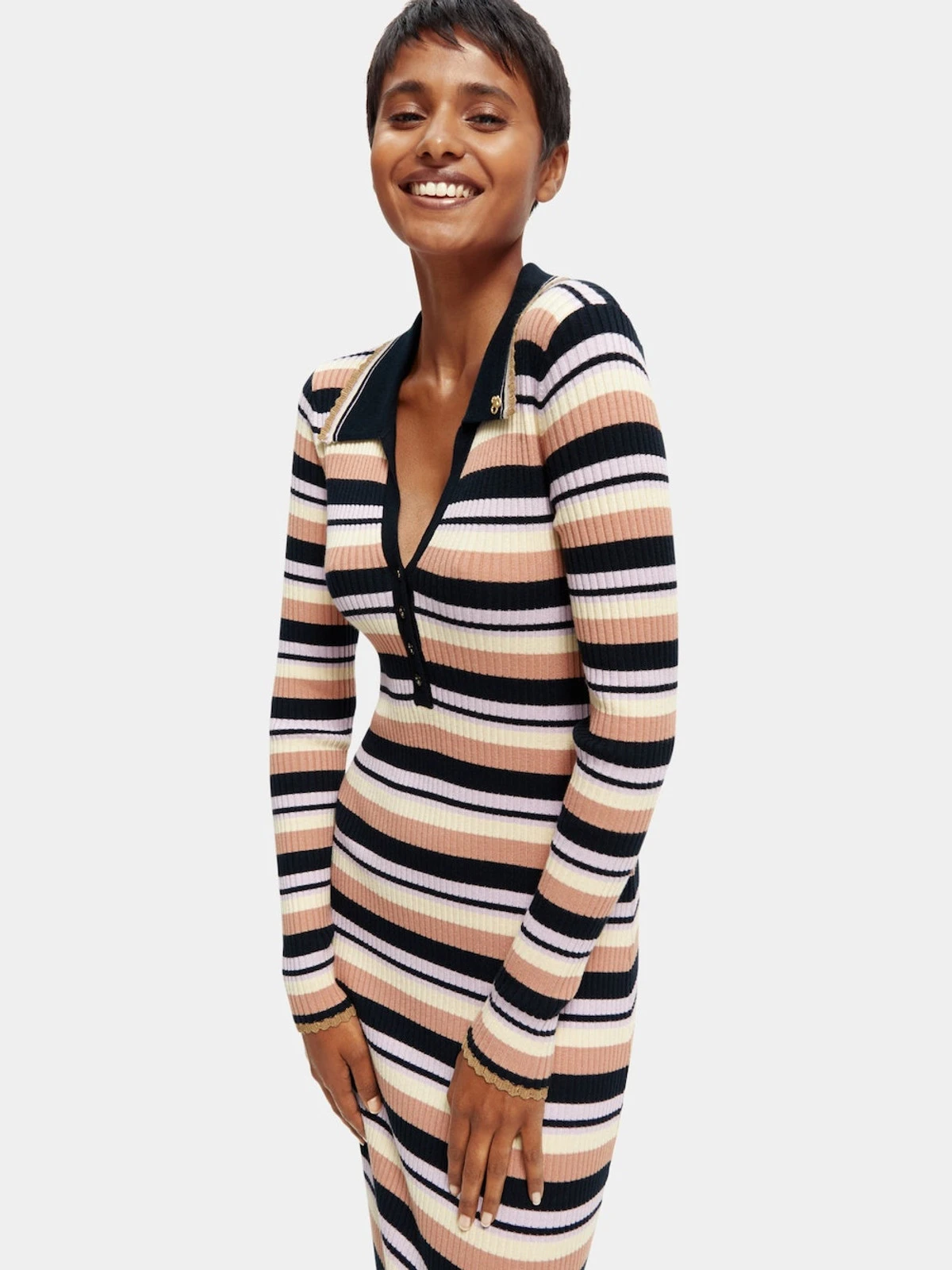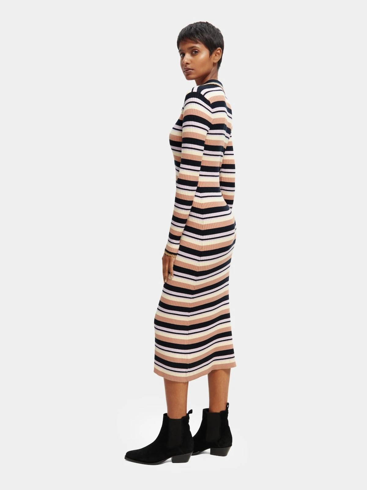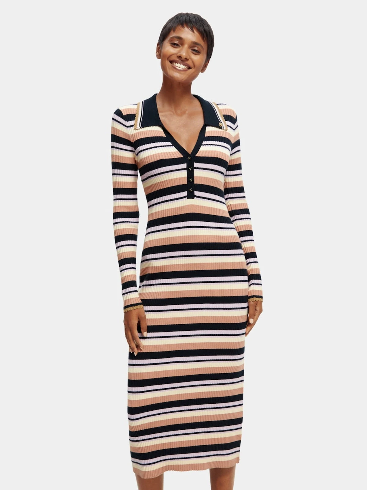 Our latest midi dress comes with long sleeves and a striped motif. Made with a fitted rib knit, this dress features a v-neckline and a four-value placket with classic polo shirt collar. This garment is partially made of LENZING ECOVERO branded viscose fibers manufactured by Lenzing AG. An alternative to conventional viscose fibres, these fibres are produced using wood pulp from responsibly managed forests. Compared to conventional viscose, the manufacturing of this fiber is energy efficient and saves water. LENZING and ECOVERO are trademarks of Lenzing AG.