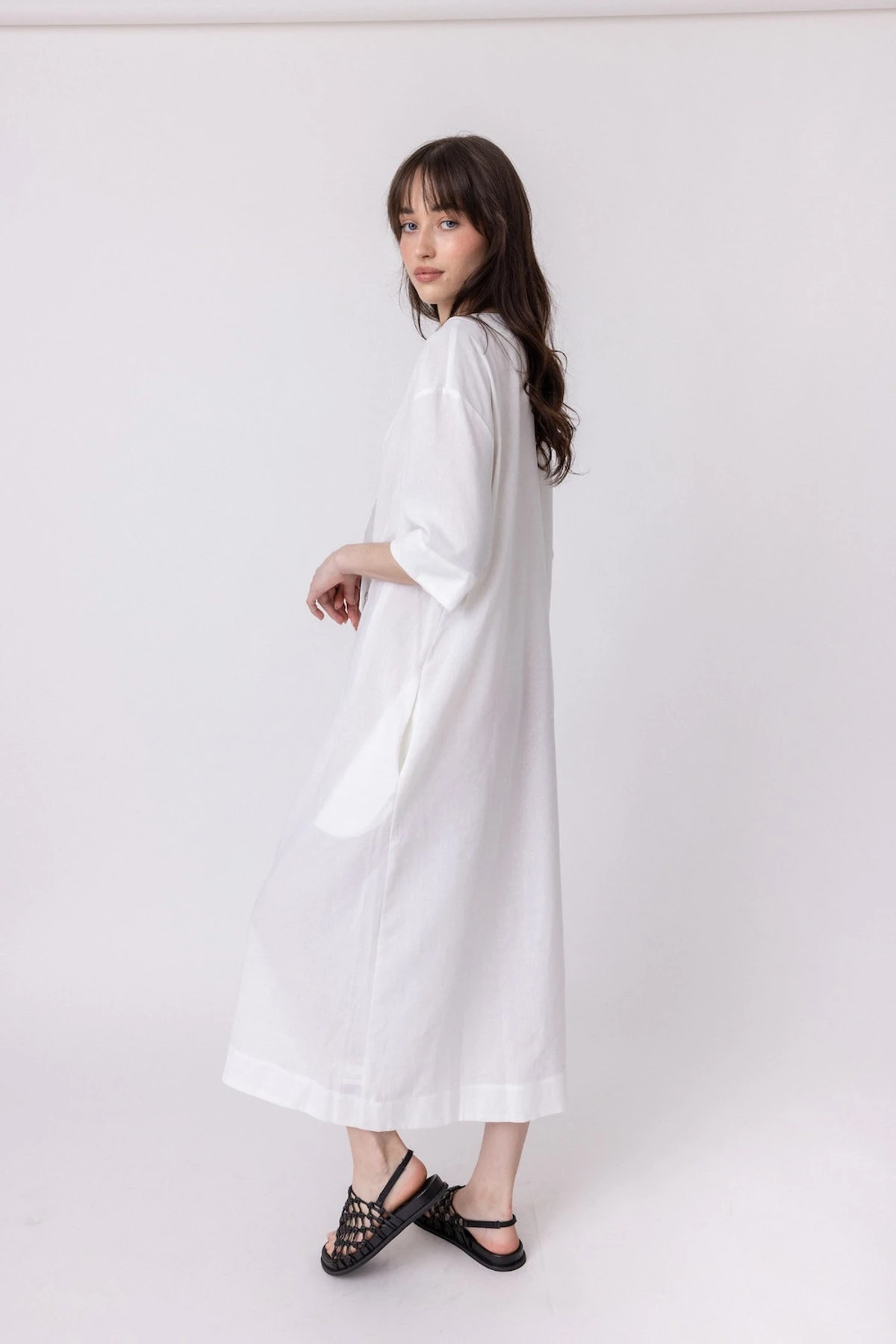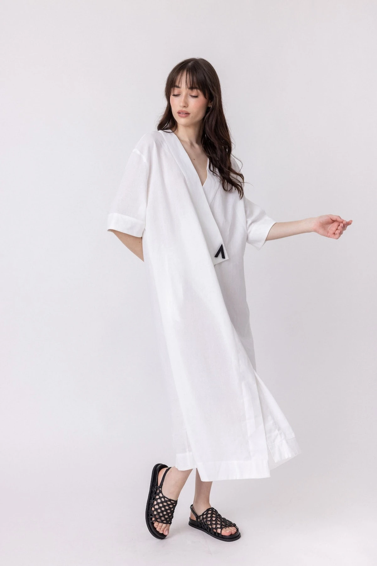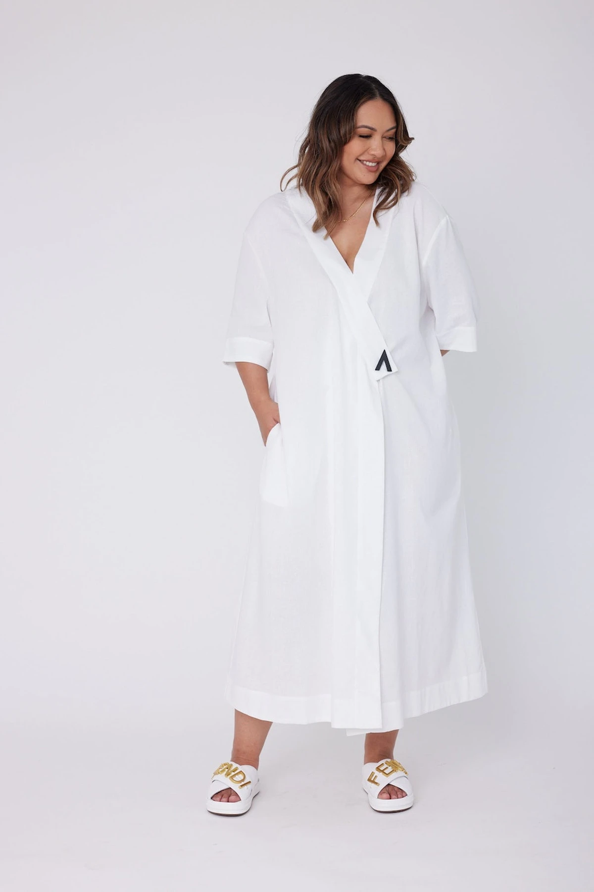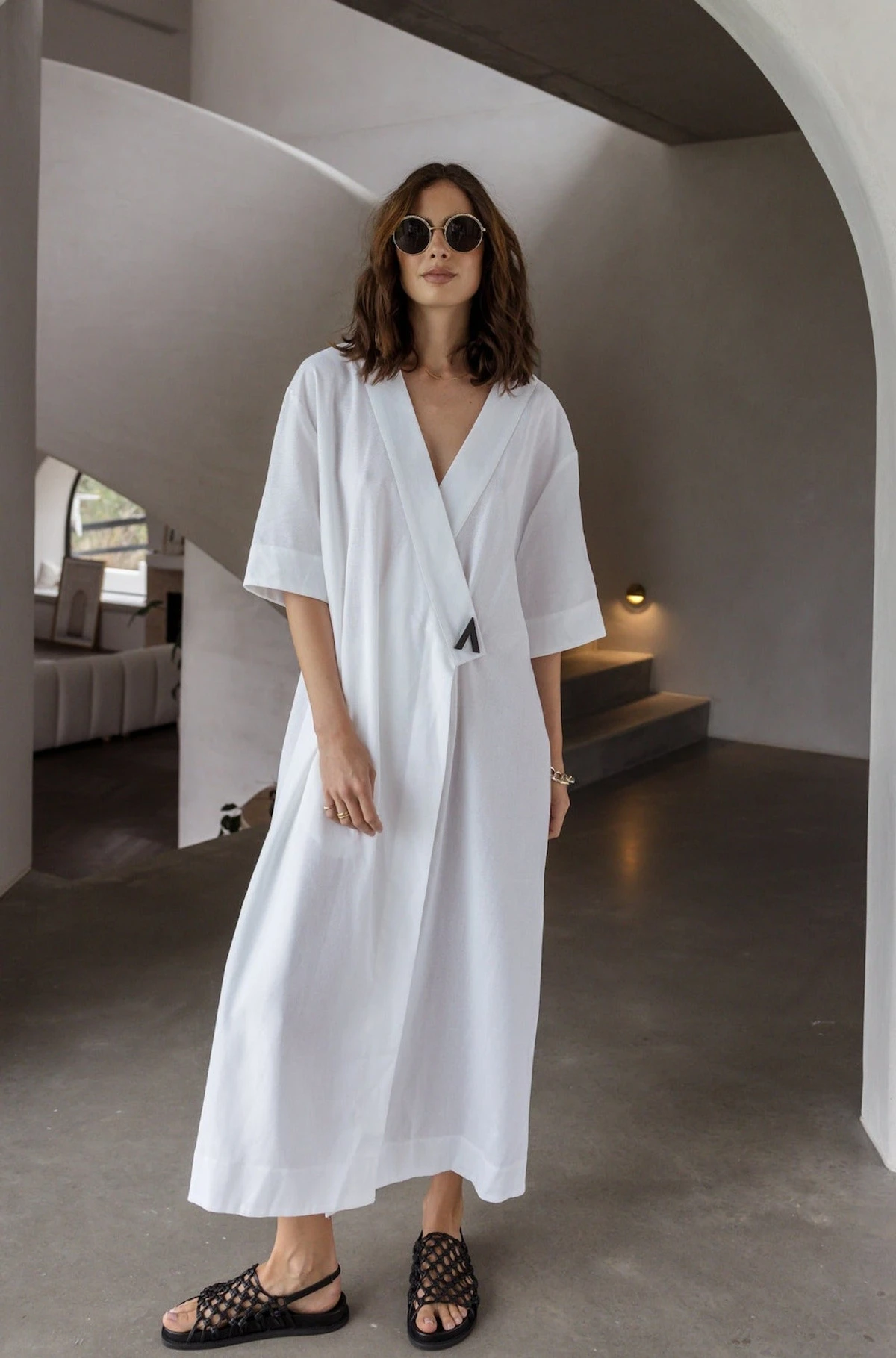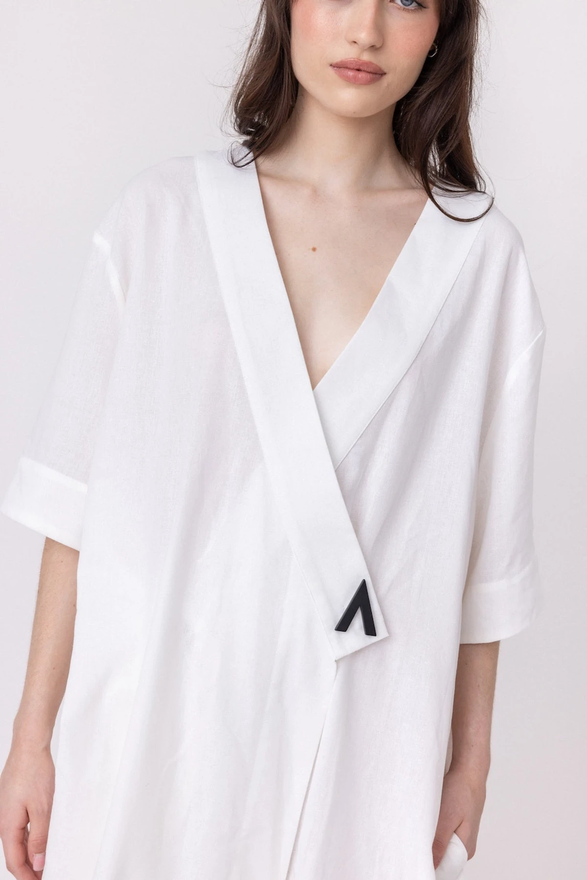 Elevate your resort style with the VINCENTI in White. Its relaxed fit is made elegant by a Japanese-inspired wrap-like design, while a low v-neckline adds a touch of sultriness to the overall look. The wrap is closed with a dress stud value with an A wooden value atop for minimalist branded decoration.